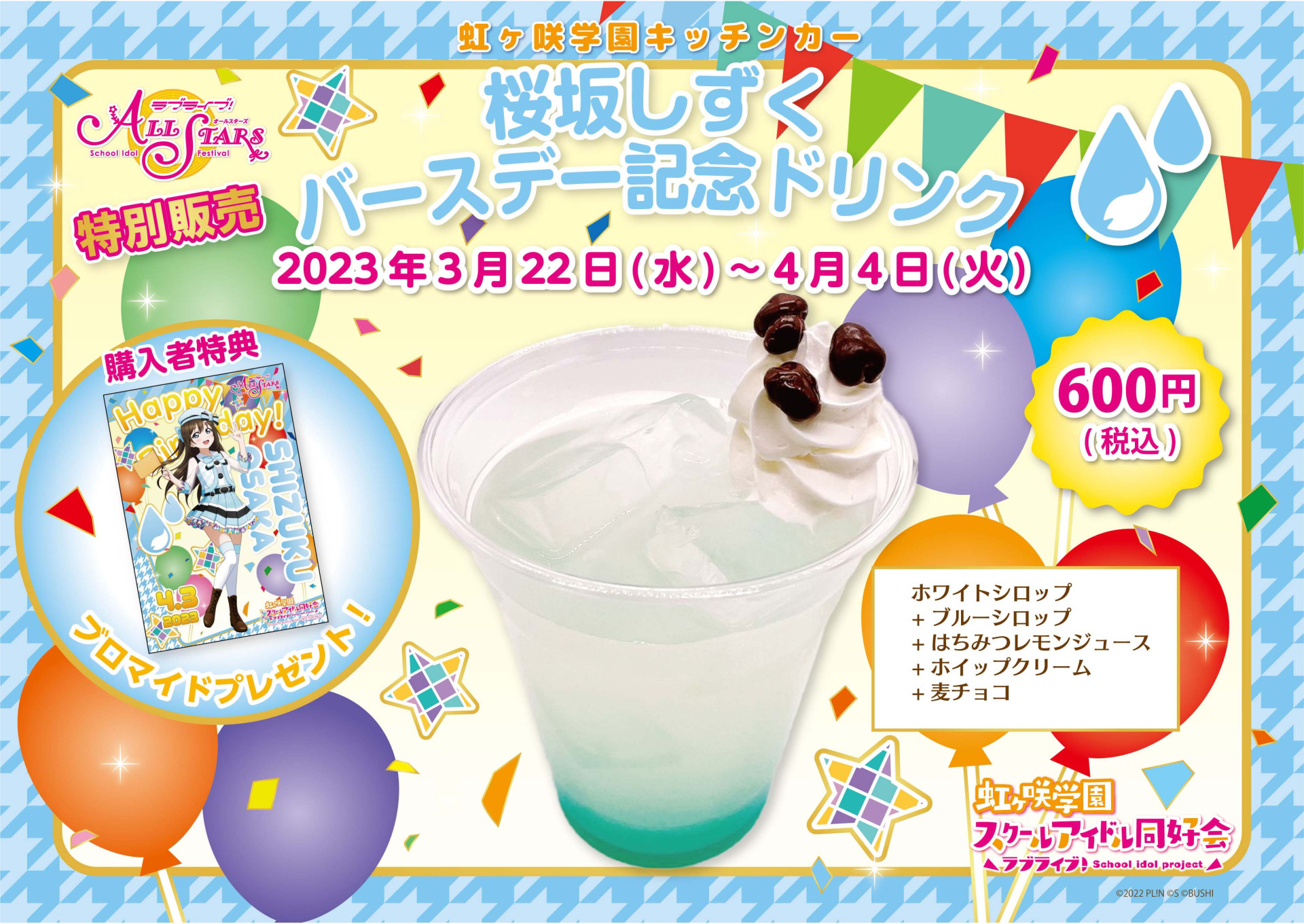 下記期間でバースデー記念ドリンクメニューの販売、記念ドリンク購入者様への特典ブロマイドお渡し、メッセージボードの展示をいたします。