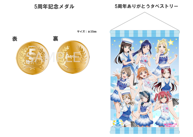 | … | Aqours 5周年を記念するスペシャルなメダルです。メダルは質感のある金属製、5周年ロゴを立体感のある仕様で表現しました。 |